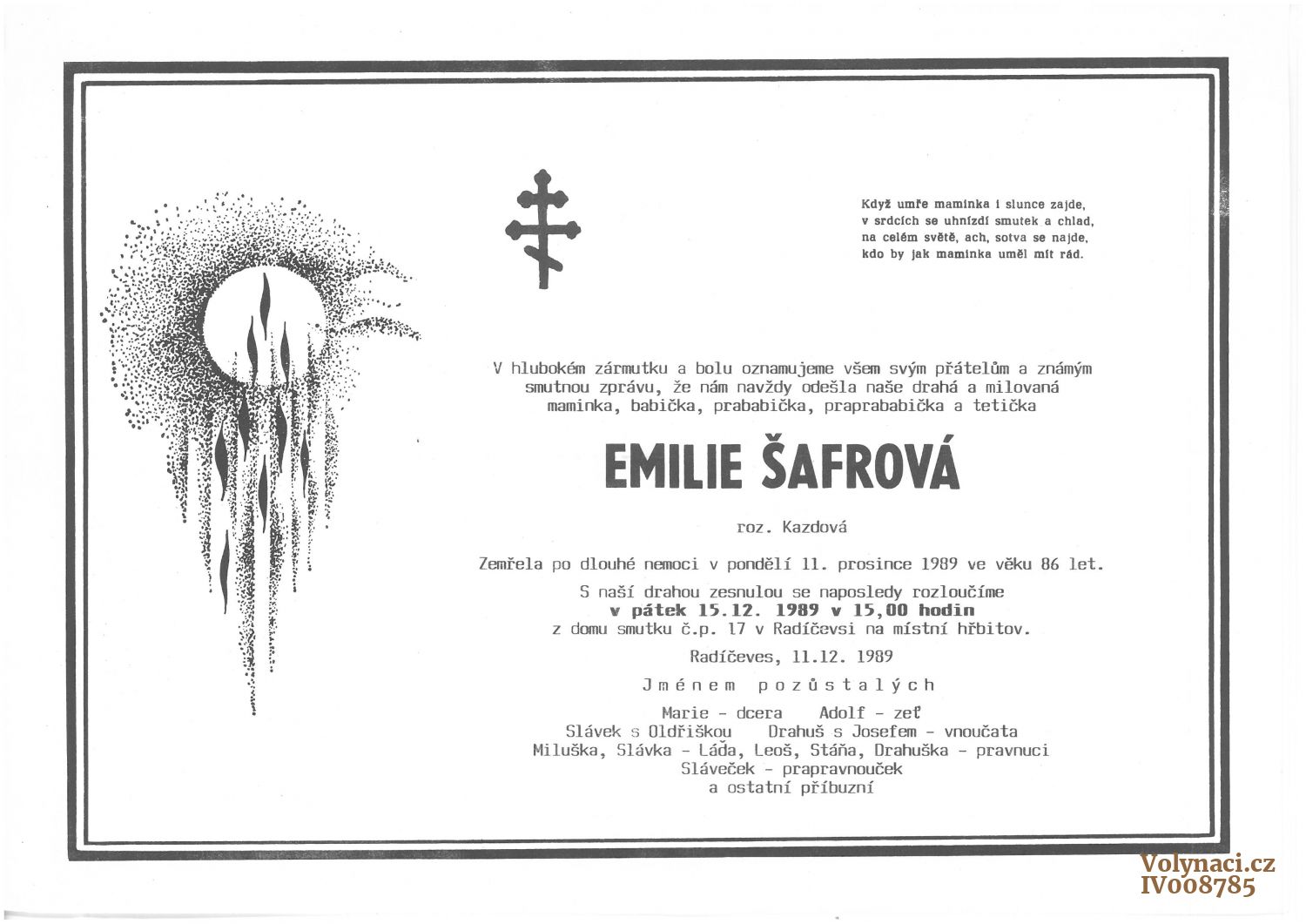 | Úmrtí | † 11. 12. 1989, hřbitov Radíčeves |