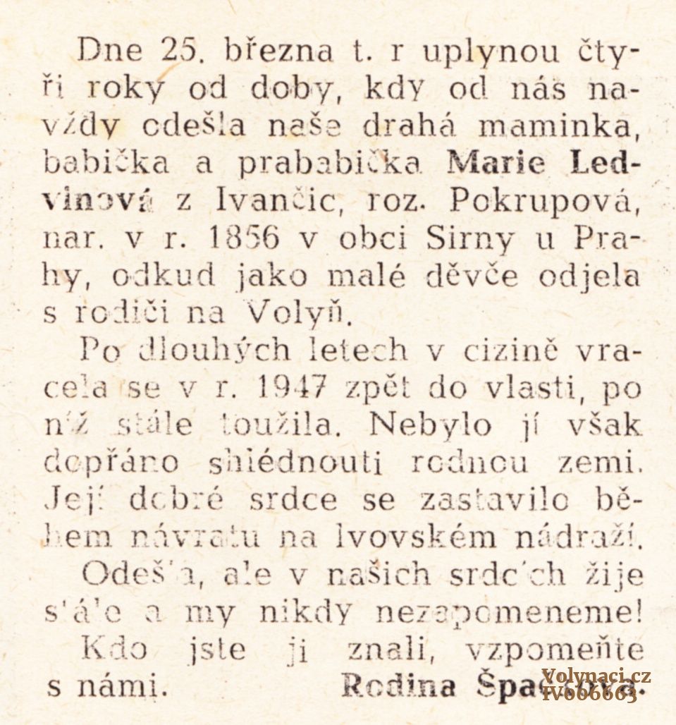 Návratu do Čech se bohužel nedočkala. Při reemigraci zemřela na nádraží ve Lvově.