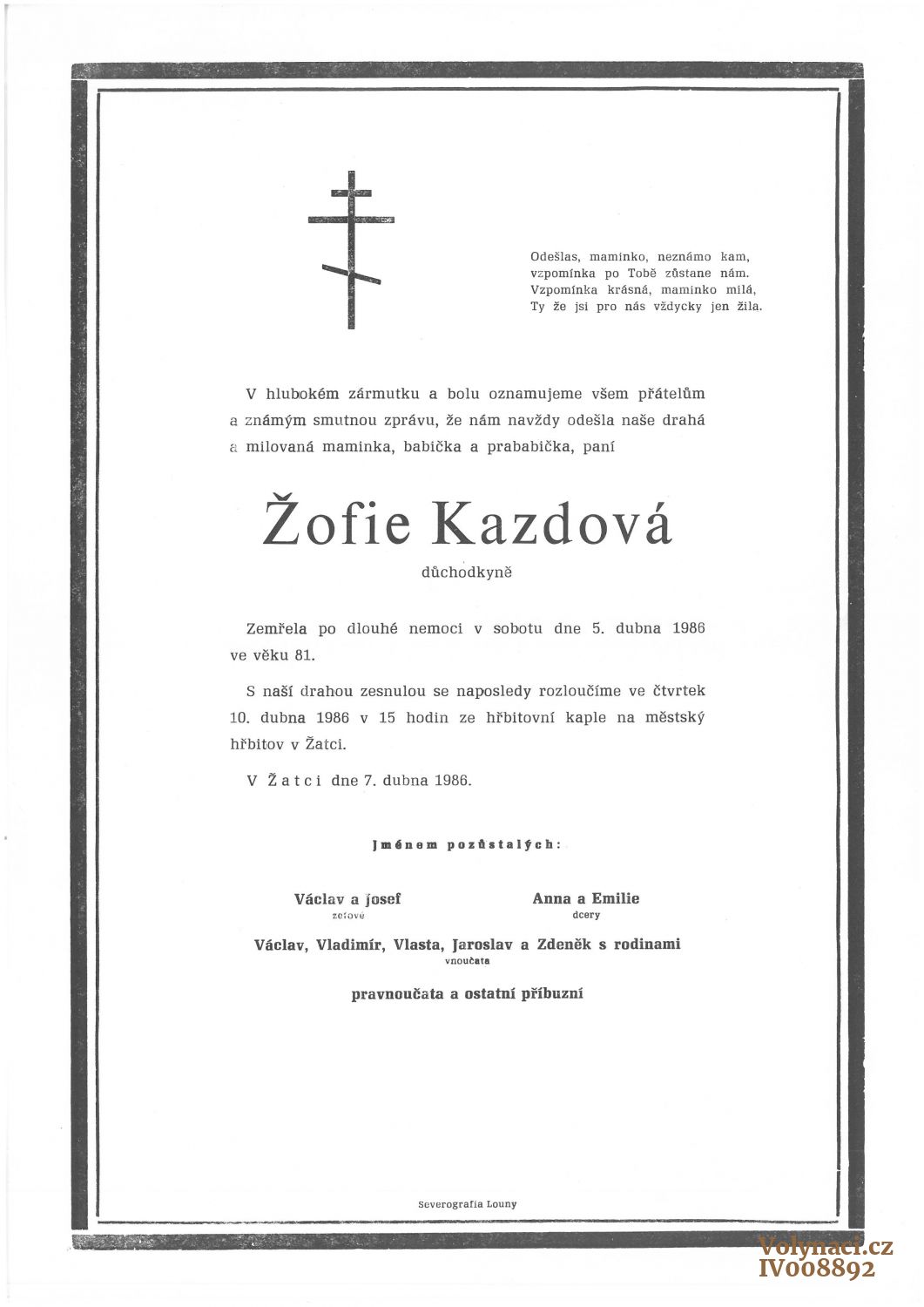 | Úmrtí | † 5. 4. 1986, hřbitov Žatec |