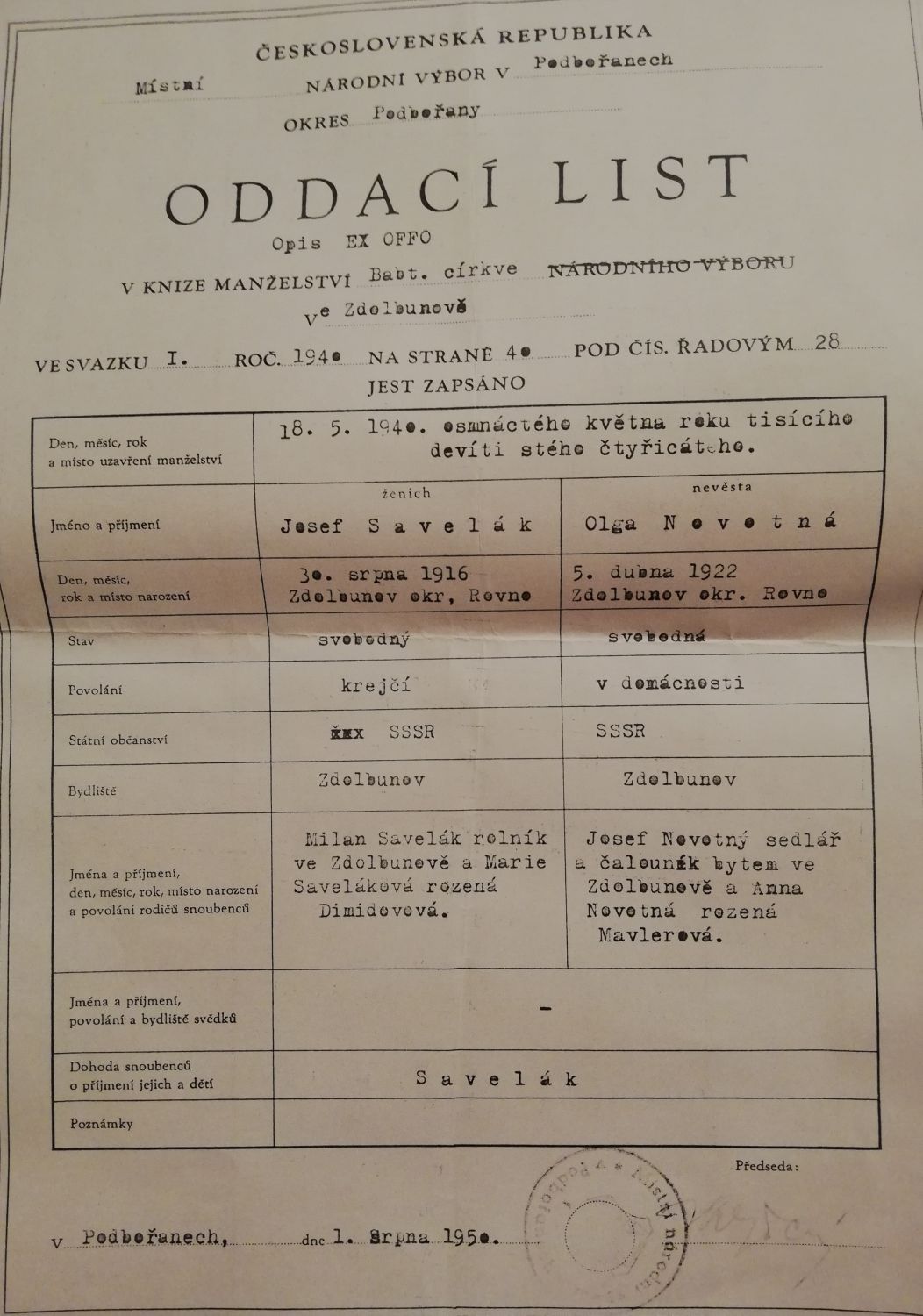 Listina o udělení československého státního občanství Savelák Josef, Miron *30.8.1916 a Saveláková Olga roz. Novotná *5.4.1922