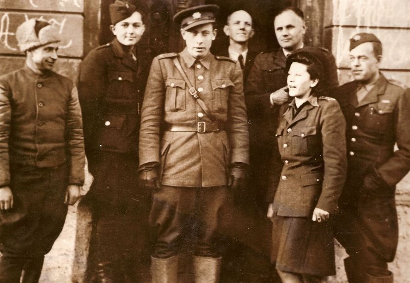 Vánoce 1945 v Podbořanech – 23. 12. 1945. Skupina Volyňských Čechů, zprava: ppor. Rozhoň, rtm. Helena Albrechtová-Křikavová (adm.), ppor Jaček, rtm. Josef Masopust, ppor. Kracík Emil, voj.,Oldřich Meduna, por. Josef Rejzek.