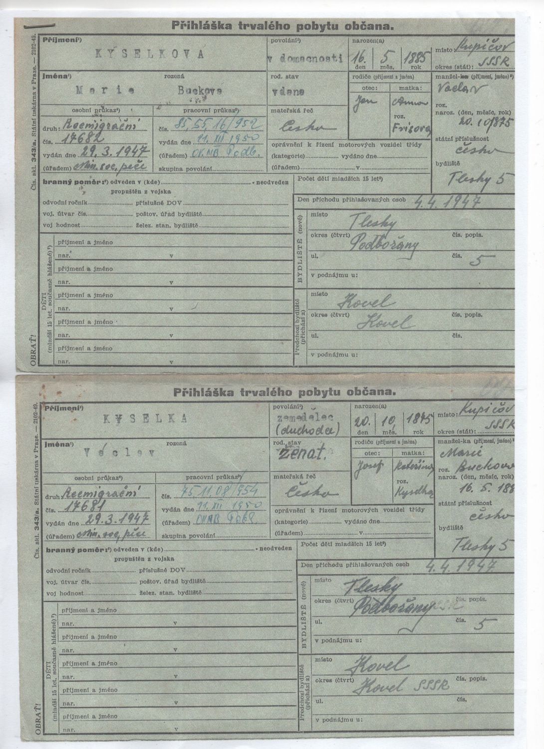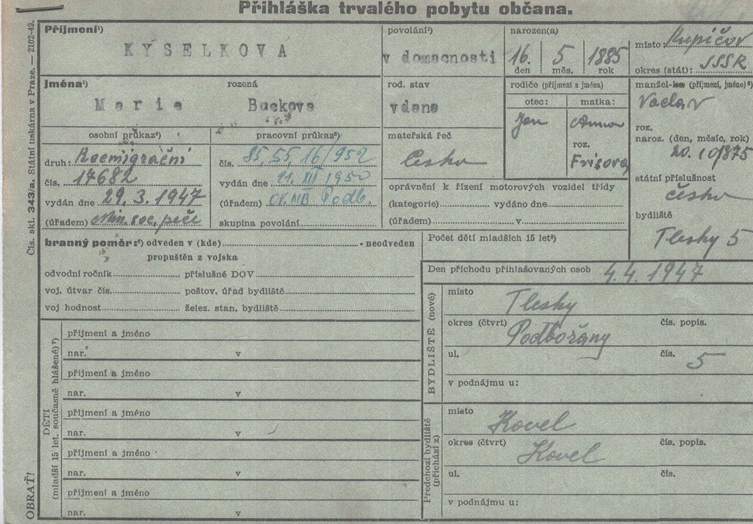 Přihláška trvalého pobytu občana Kyselková Marie, Jan, Bucková * 16.5.1885 Kupičov Otec: Jan Bucek Matka: Anna roz. Frísová