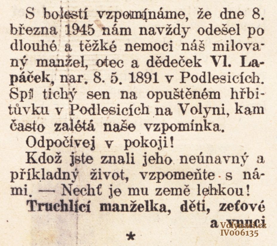 Nekrolog Vladimíra Lapáčka z Podlesic na Volyni.