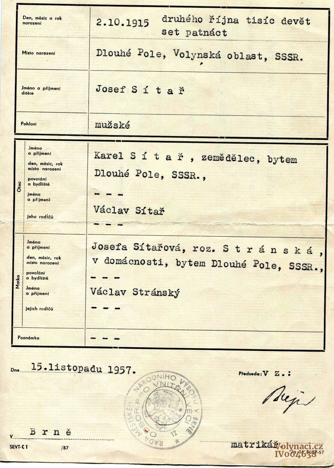 Josef Sitař, Karel opis matriky narození 2.10.1915 Dlouhé Pole; rodiče Karel a Josefa dcera Václava Stránského; kmotři Jan syn Františka Janouška a Anna dcera Jana Stránského