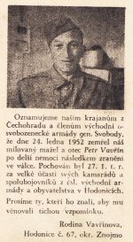 Petr Vavřín v databázi VHA neúplné záznamy. Chybí datum narození i obec. Jediné co v tomto nekrologu je, že zemřel 24.1.1952 v Hodonicích okres Znojmo.