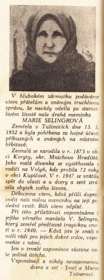 Jako 2 letá se vystěhovala s rodiči na Volyň, kde v obci Kupičově prožila 72 let. Její muž V. Selinger předčasně zemřel tragickou smrtí v r. 1940. Po návratu do Čech r. 1947 žila u své dcery Marie Tošnerové a jejího muže Josefa Tošnera.