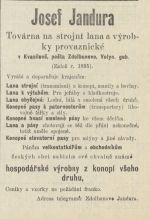 Josef Jandura, továrna na strojní lana v Kvasilově, Rok: 1911, Zdroj: Čechoslovan 21.01.1911, ročník I., č.1, Inventární číslo: IV011922
