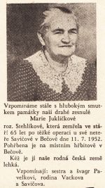 Zemřela ve stáří 65 let po těžké operaci u své neteře Savičové v Bečově.