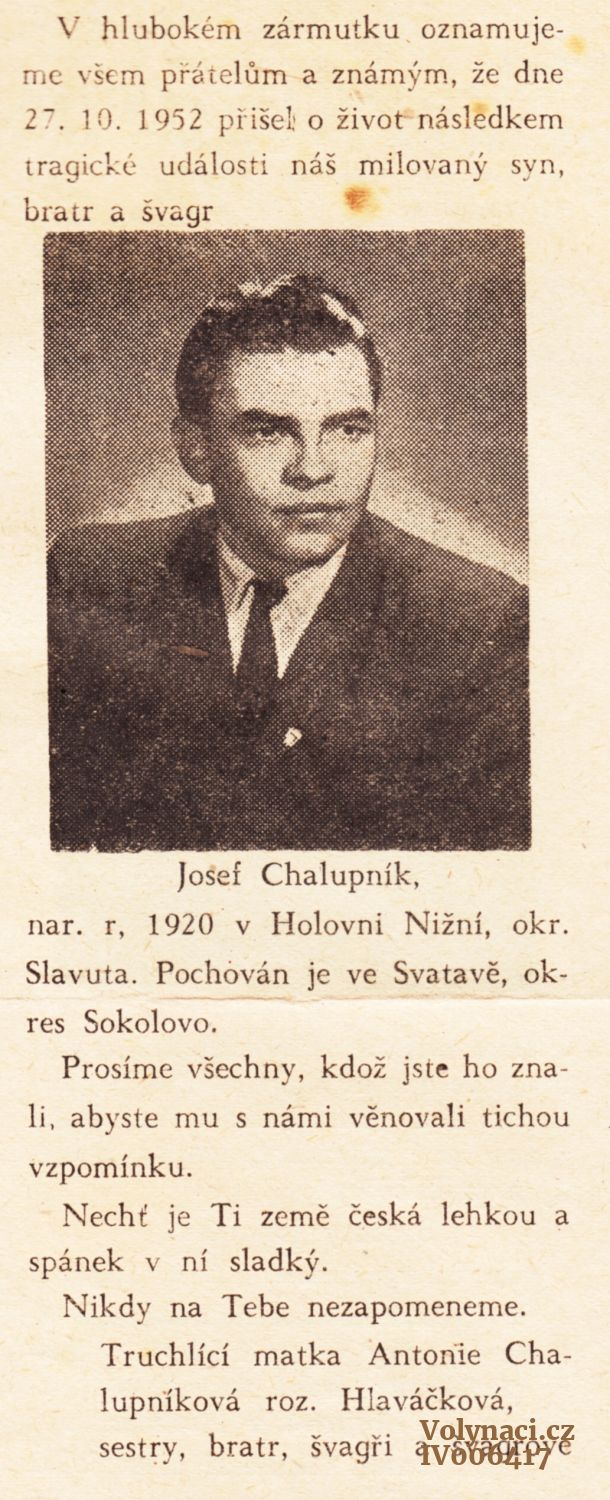 | Úmrtí | † 27. 10. 1952, tragická událost, hřbitov Svatava u Sokolova. |