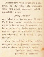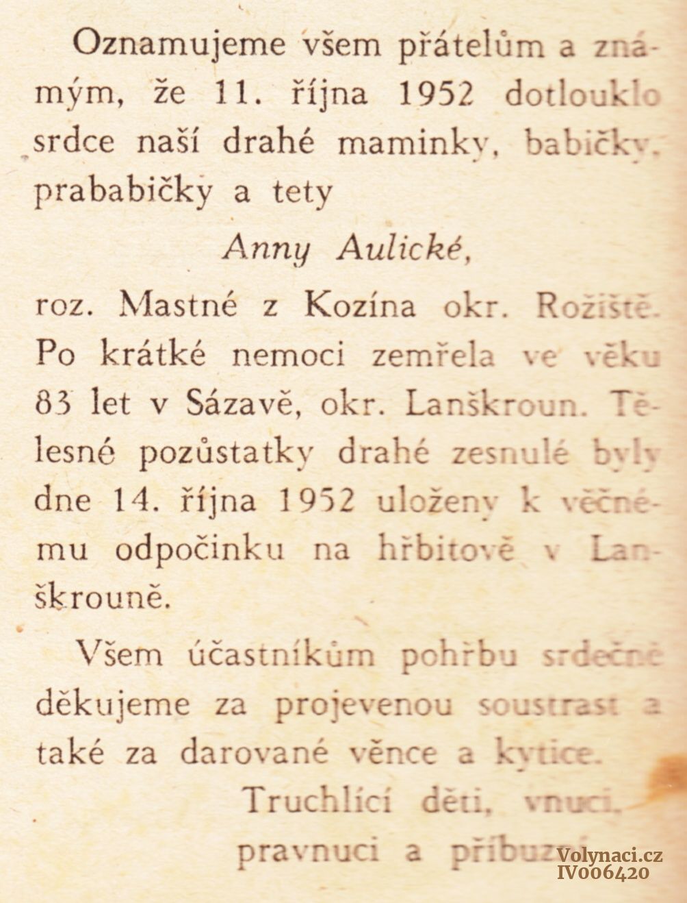 Nekrolog Anny Aulické rozené Mastné z Kozína na Volyni.