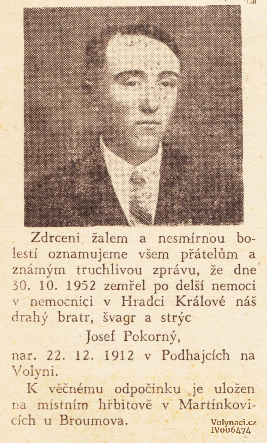 Nekrolog Josefa Pokorného, Rok: 1952, Zdroj: Věrná stráž 31.12.1952 str.8, Inventární číslo: IV006474