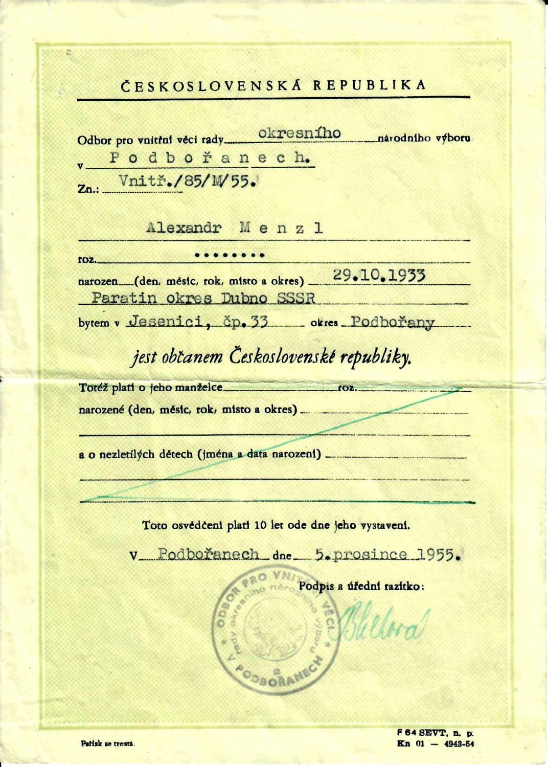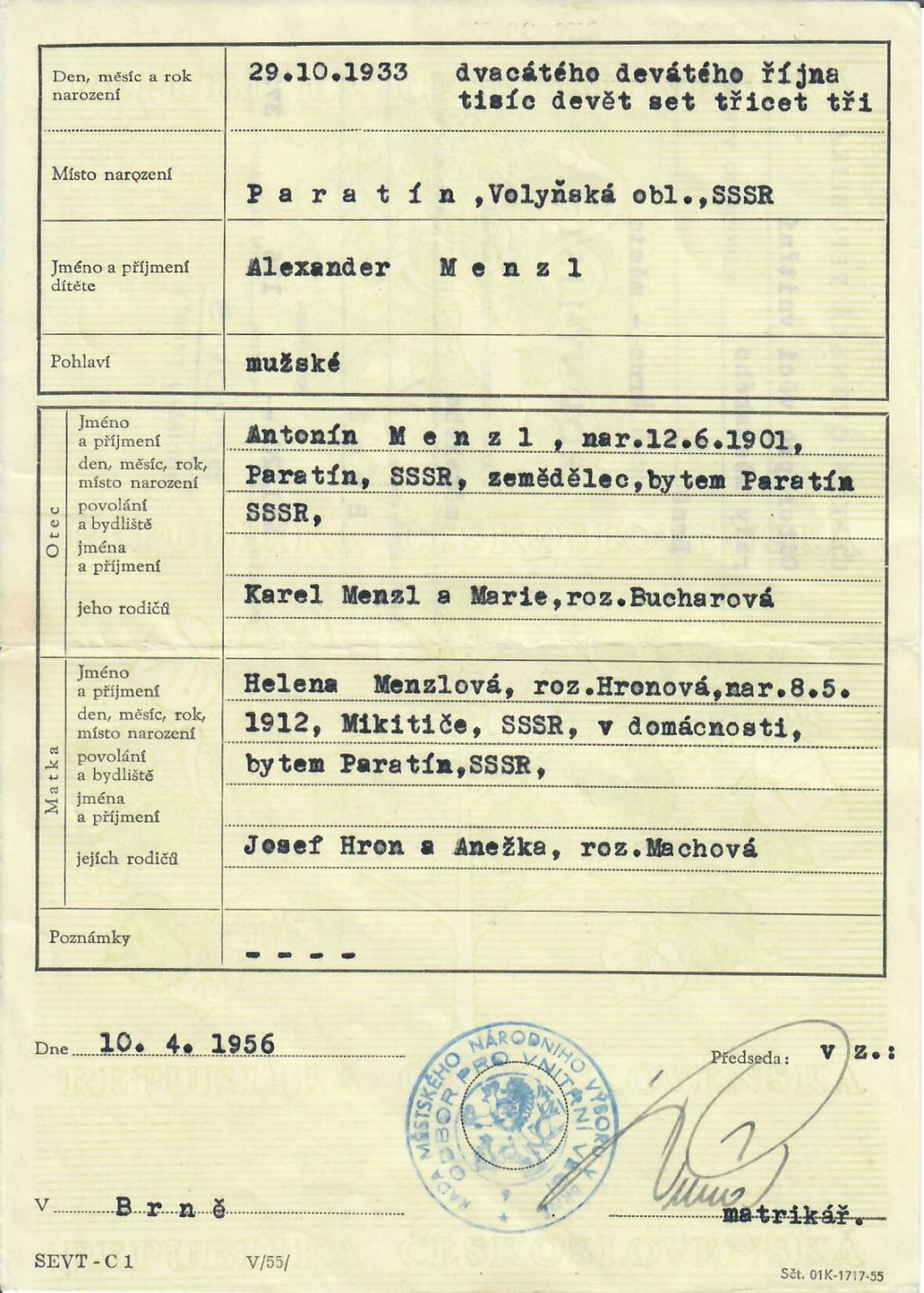 Menzl Alexandr, rodný list z Brna