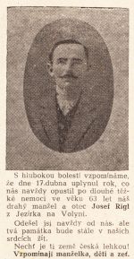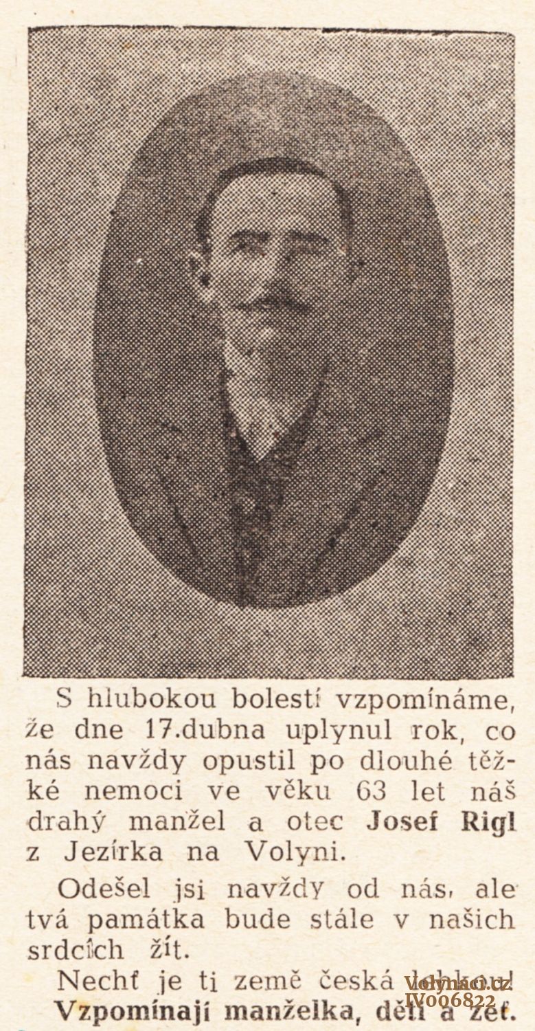 nekrolog Josefa Rígla z Jezírka na Volyni