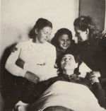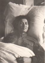 Růžena Biněvská (na lůžku) po zranění v autonehodě. Zleva: Lydie Kostrhunová, dcera Věra Biněvská, Julie Laštovičková. Růžena Biněvská zranění po dlouhé nemoci podlehla.