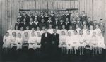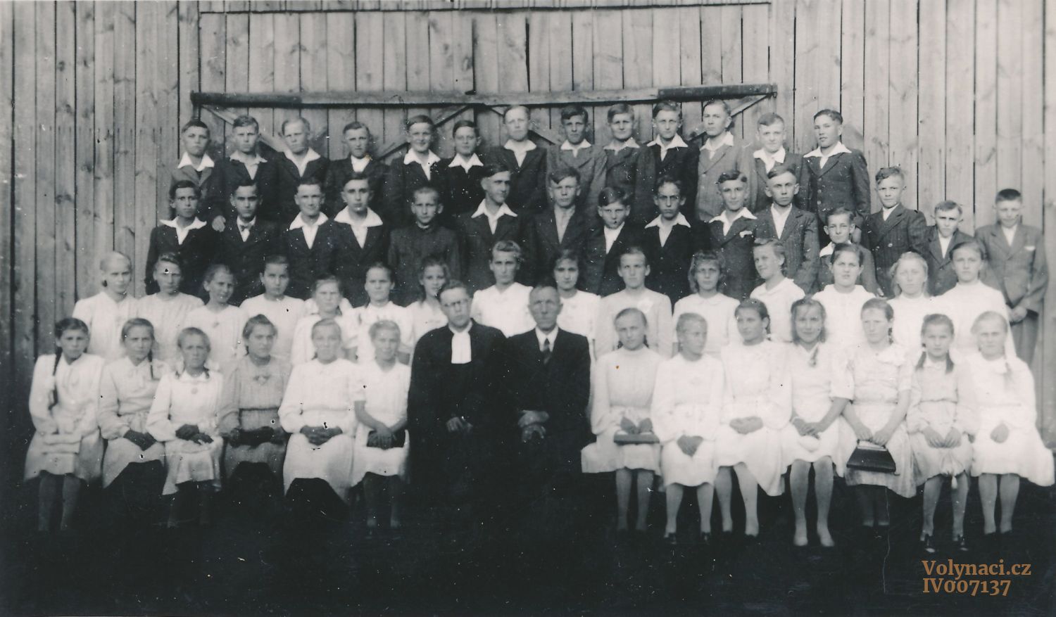 Konfirmace v evangelickém sboru v Novém Městě pod Smrkem (1947) - vpředu uprostřed farář Blažek