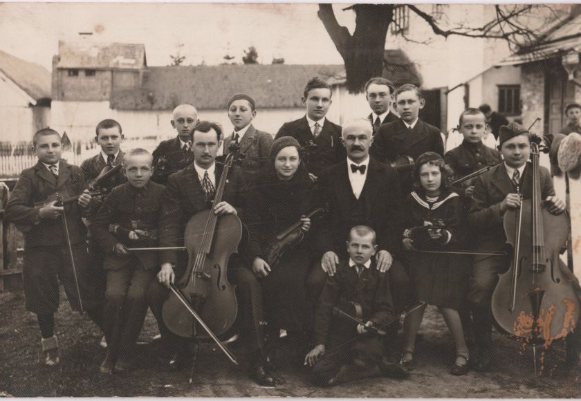Nejmladší vpředu před učitelem je s houslemi tehdy jedenáctiletý Jan Maňas. Pokud je na fotce Jan Maňas starší (ročník 1901), tehdy 34-letý, tak je pravděpodobně vzadu hned u stromu bez nástroje, což by byla křídlovka.