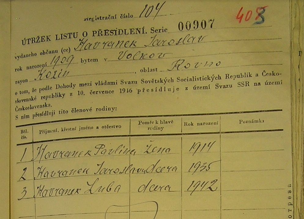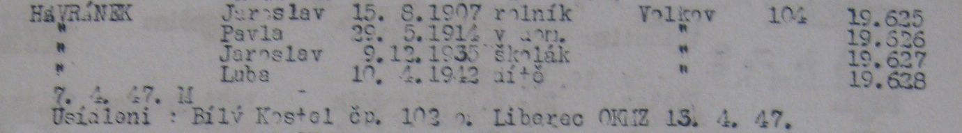 detail z útržku listu o přesídlení rodiny Jaroslava Havránka