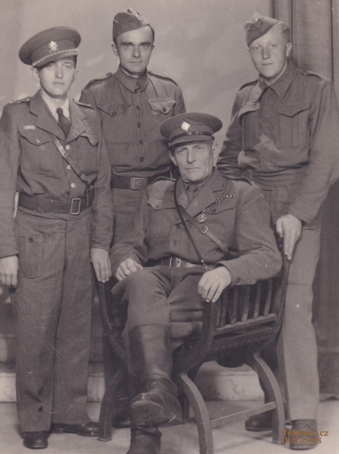 sedící vedoucí skupiny Josef Václav Rejzek - novinář, zleva Václav Rejzek, Antonín Špatenka, xxx Špatenka