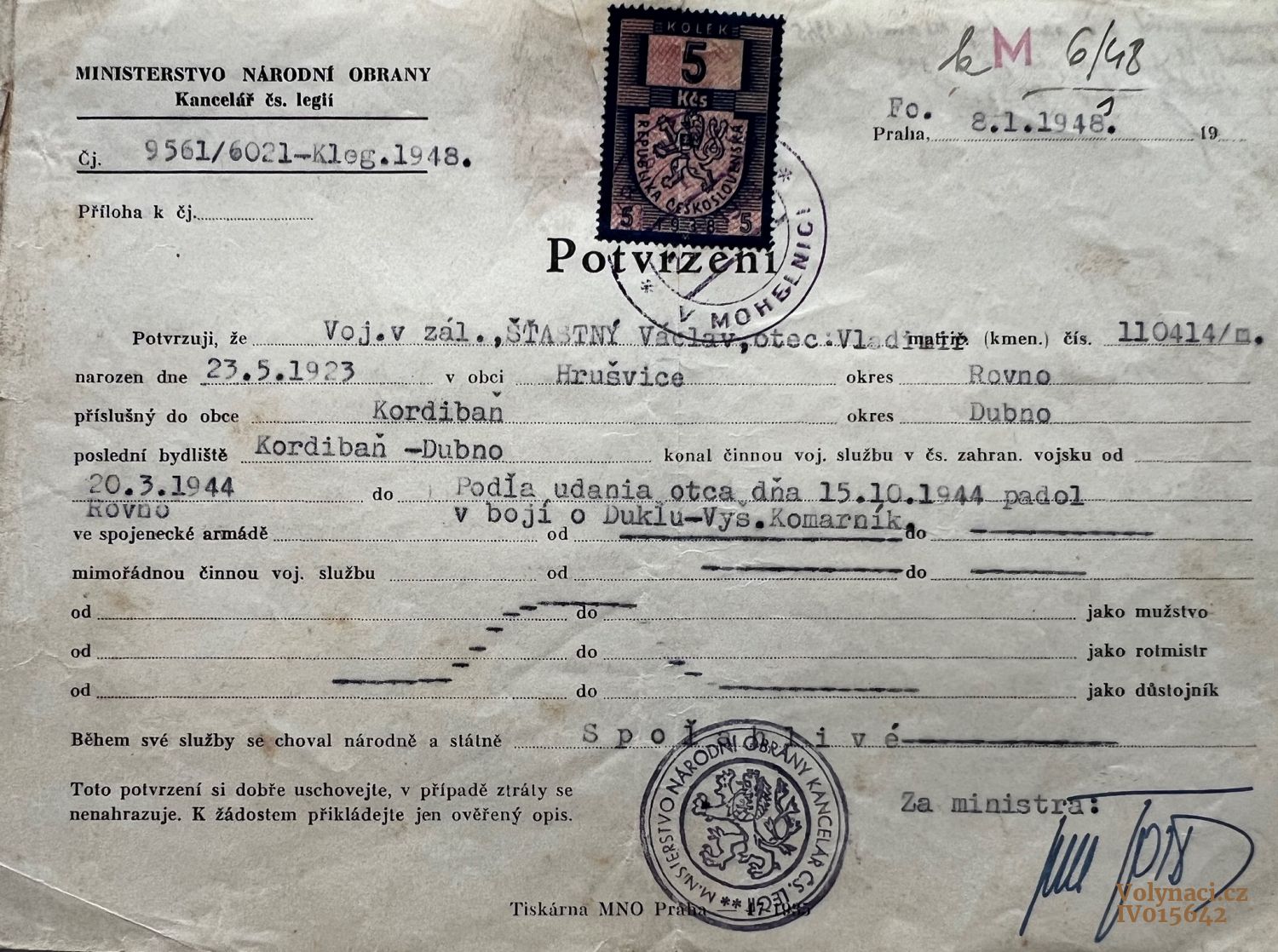 | Úmrtí | † podle údajů otce; 15. 10. 1944, Karpaty, Vyšný Komárnik, 1.čs.armádní sbor, |