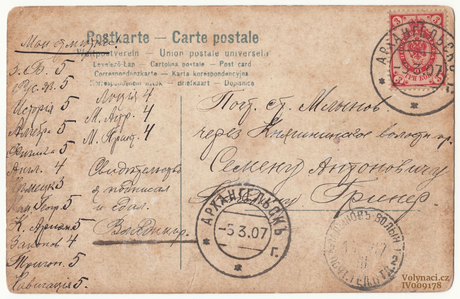 Školní prospěch, který Vladimír Griner poslal na pohlednici rodičům z námořní školy v Archangelsku.