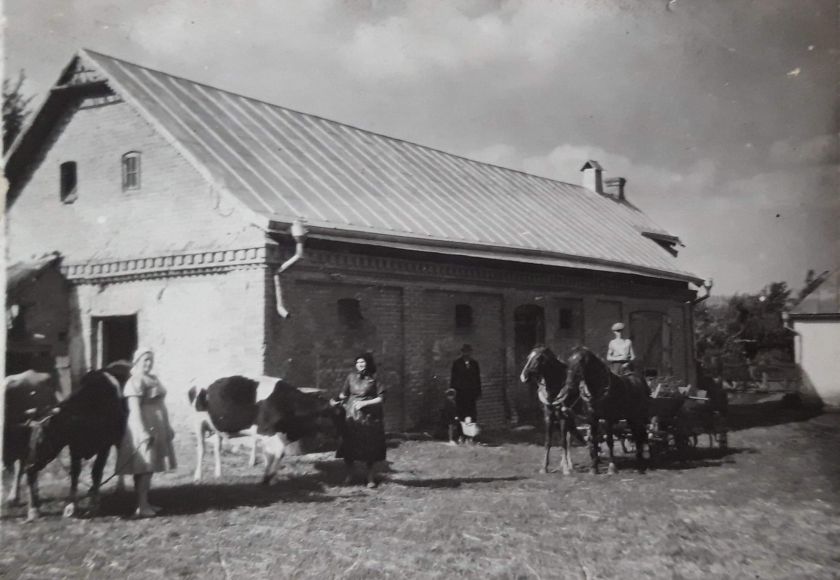Chlév pro koně a skot - vzadu je sušárna chmele Ve světlých šatech je matka Jiřího Libuše, nar. Novostavce. S koňmi je otec Jiřího Josef, nar. Noviny České.