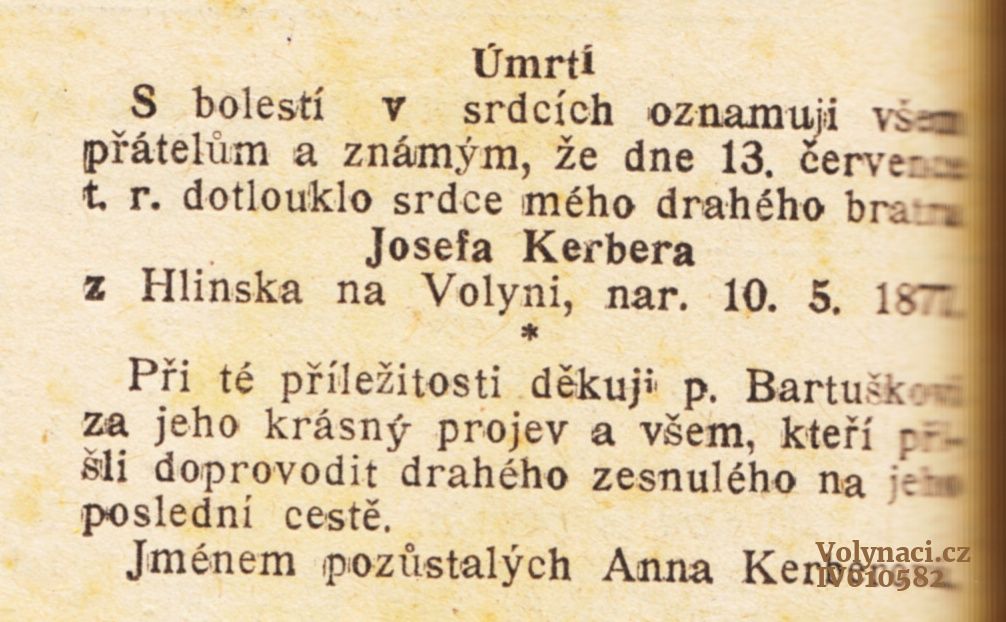 Nekrolog Josefa Kerbera z Hlinska na Volyni.