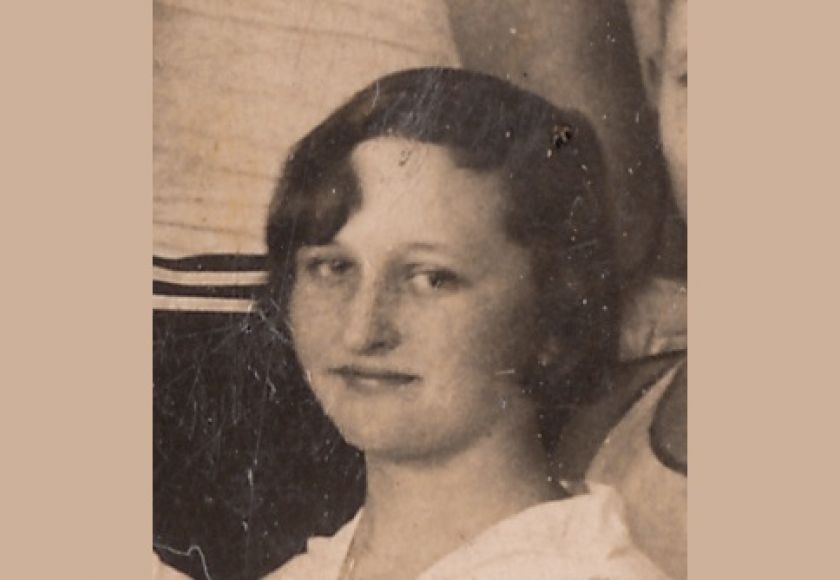 Společná fotografie obyvatel Hulče, při návštěvě jejich rodáka, který přijel z Ameriky (silnější pár sedící v řadě za dětmi).