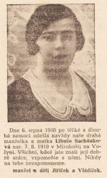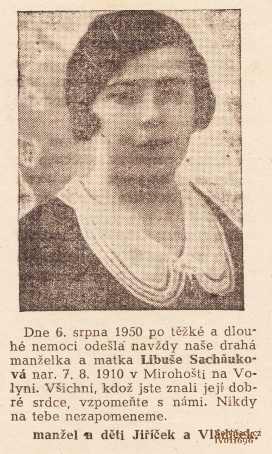 Nekrolog Libuše Sachňukové z Mirohošti na Volyni.