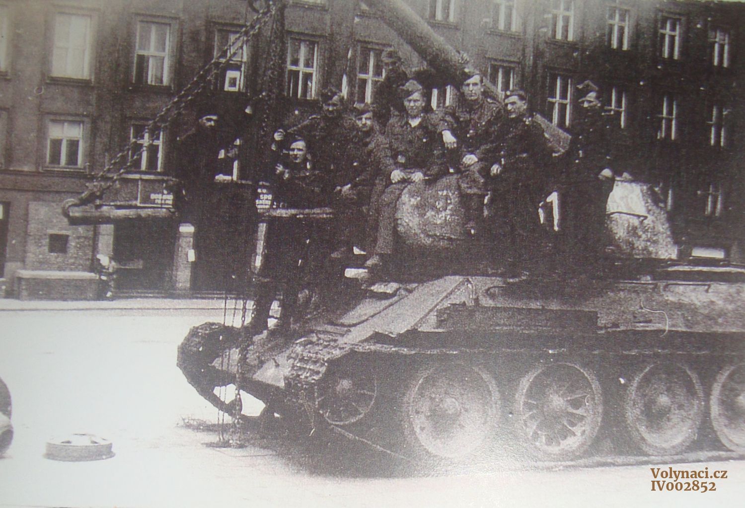 Tank, který byl v Ostravsko-opavské operaci rozbit a nyní slouží jako památník, Josef Vyletěl třetí zprava