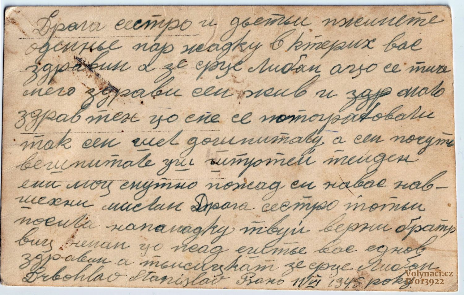 Drahá sestro a děti, přijměte ode mne pár řádků, ve kterých vás zdravím. Jsem živ a málo zdráv, mezi co jsme se fotografovali, tak jsem šel do špitálu a jsem posud ve špitále už čtvrtej tejden, je mi skučno, pořád si na vás všechny myslím. Drahá sestro to ti posílá na památku tvůj věrný bratr, víc nemám co psát, ještě vás jednou zdravím a stiskám? ze srdce. Stanislav Drbohlav. Psáno 11.6.1945