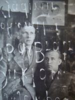 Bohumil Filípek (vpravo) se svým bratrem Vladimírem, prosvítá nápis z druhé strany fotografie
