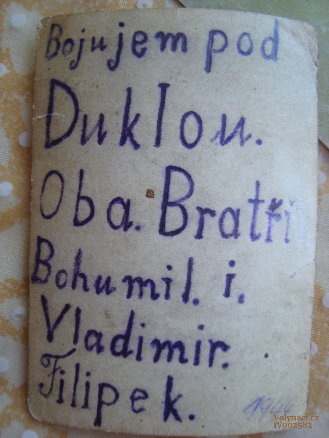 Podplukovník v. v. Bohumil Filípek se narodil 22. října 1922 v obci České Noviny na Volyni. Po absolvování pěti tříd obecné školy se učil cukrářem, ale s příchodem sovětského režimu na Volyň v roce 1939 se jeho život značně změnil. V té době pracoval ve městě Dubno, ale hlad a bída ho přivedly k návratu do rodné obce. Těšil se na maminčinu kuchyni. To se mu stalo osudným, neboť byl zatčen a za sabotáž práce odsouzen ke třem měsícům vězení. Svůj trest si odbyl v dubenské věznici. Po příchodu německé armády v roce 1941 byl zaměstnán ve své rodné vesnici a vyhnul se tak nucenému nasazení. V létě 1943 se léčil v malínské nemocnici, kde došlo 13. 7. 1943 k tragédii dodnes podněcující nenávist k nacistům, totiž k vypálení a vyvraždění obce Český Malín. Pan Bohumil Filípek se s dalšími jedinci odebral do sklepení nemocnice, kde událost přežil. Po ukončení všech násilností se rozběhl do Českých Novin. Bohumil Filípek se po opětovném příchodu sovětské armády v roce 1944 přihlásil do vznikajícího 1. československého armádního sboru a jako tankový desant se zúčastnil Karpatsko-dukelské operace. Jednou se s dalšími vojáky ocitl několik kilometrů v německém týlu a společně se museli probojovat zpět ke svým řadám. Při dalším postupu byl při náletu německých letadel zraněn, léčen ve Lvově a do bojů již nezasáhl. Po válce se na Volyni oženil a v roce 1947 reemigroval do Československa. Ve svém novém domově pracoval jako soukromý zemědělec, pekař a řidič u pekáren a cukráren. Žil v Žatci, zemřel 19.2. 2015.