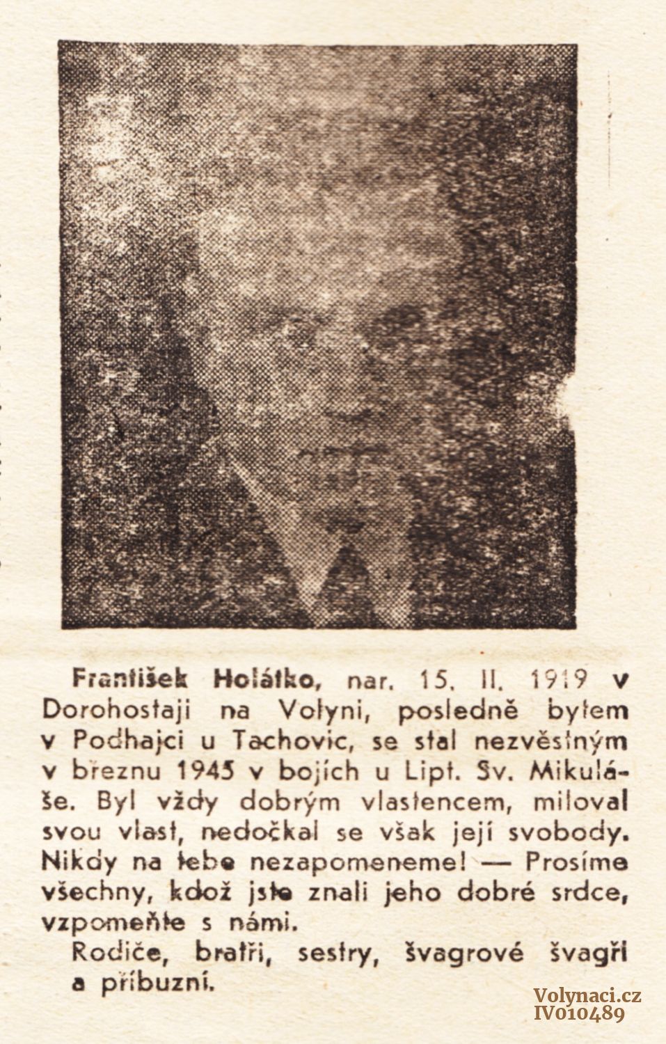 Nekrolog Františka a Antonína Holátko z Dorohostají na Volyni. U fotografií došlo v redakci zřejmě k záměně (prohození) jmen !