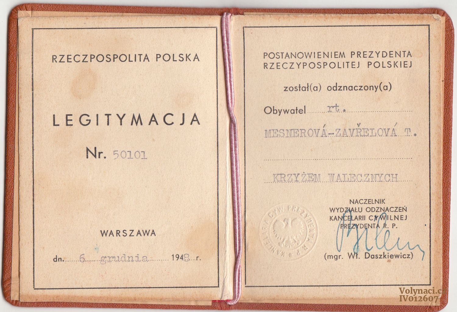 doklad z 6.12.1948 o vyznamenání rotné Taťany Mesnerové, provdané Zavřelové, Křížem za chrabrost