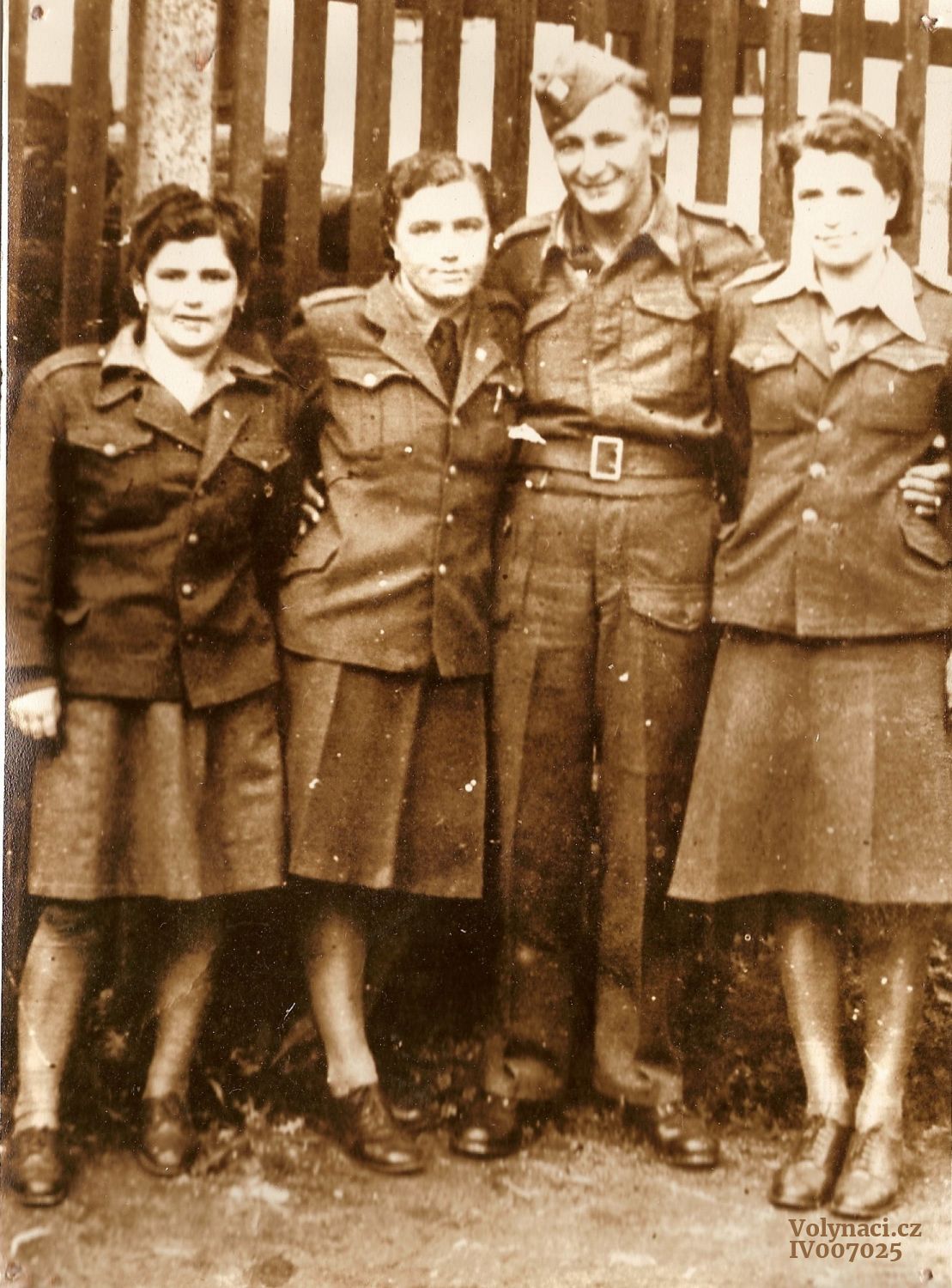 Spojařky tankové brigády. Zleva: Marie Jankovcová, Marie Mašková-Michajlovičová, Alexandr Rajm, Antonie Bílková-Vospálková. Ostrava, máj 1945.