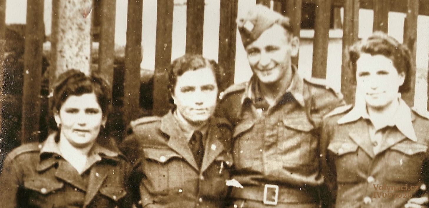 Spojařky tankové brigády. Zleva: Marie Jankovcová, Marie Mašková-Michailovičová, Alexandr Rajm, Antonie Bílková-Vycpálková. Ostrava, máj 1945.