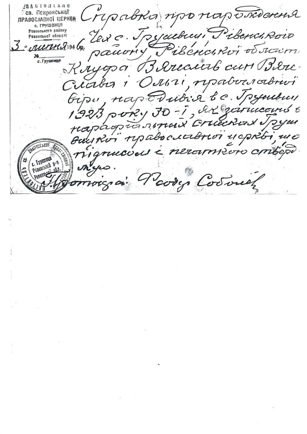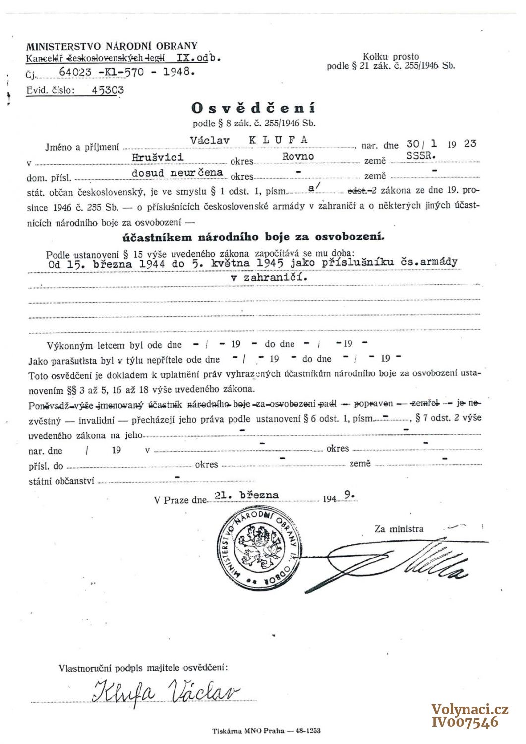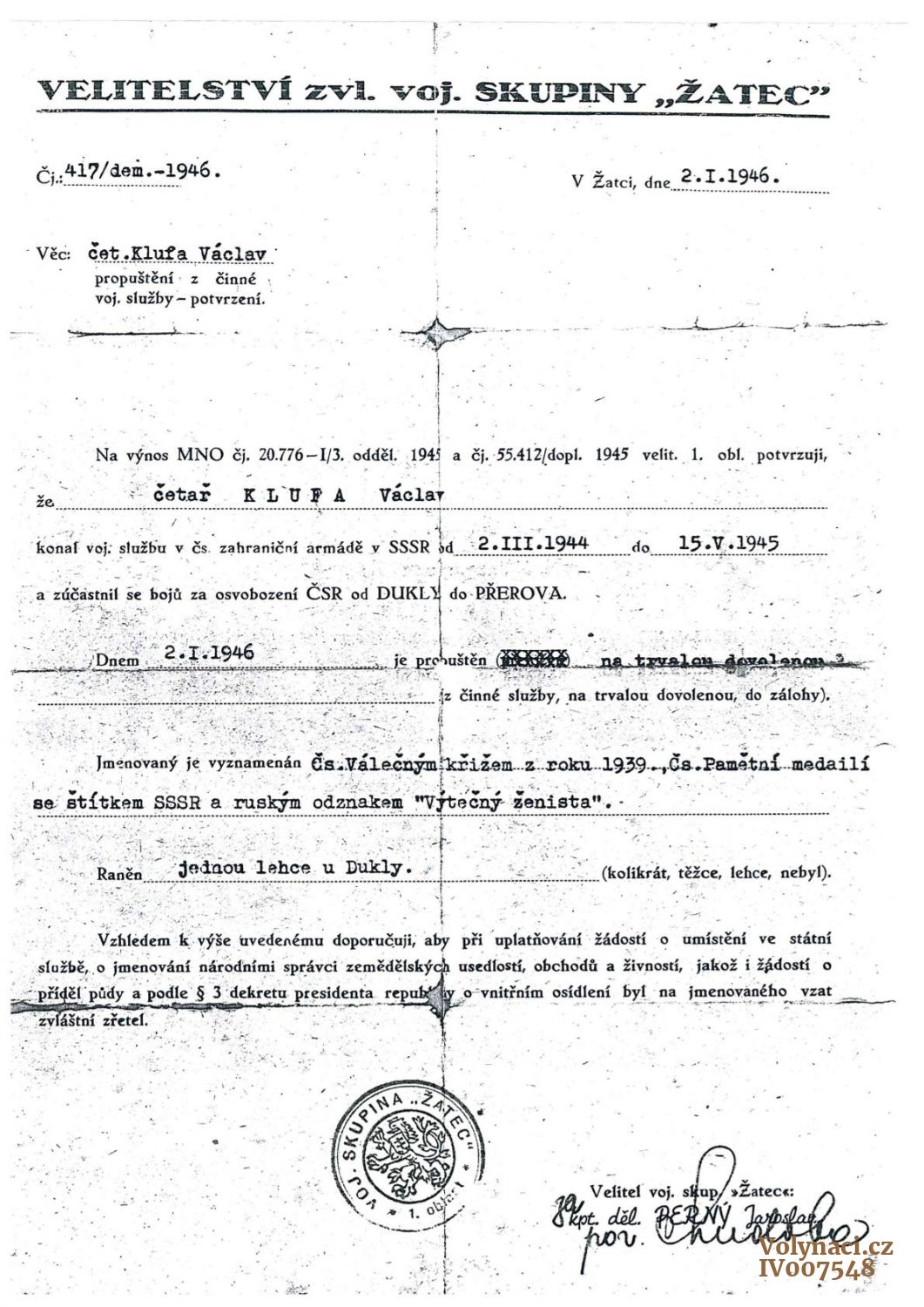 Doklad o narození Václav Klufa - potvzení církve z Hrušvice