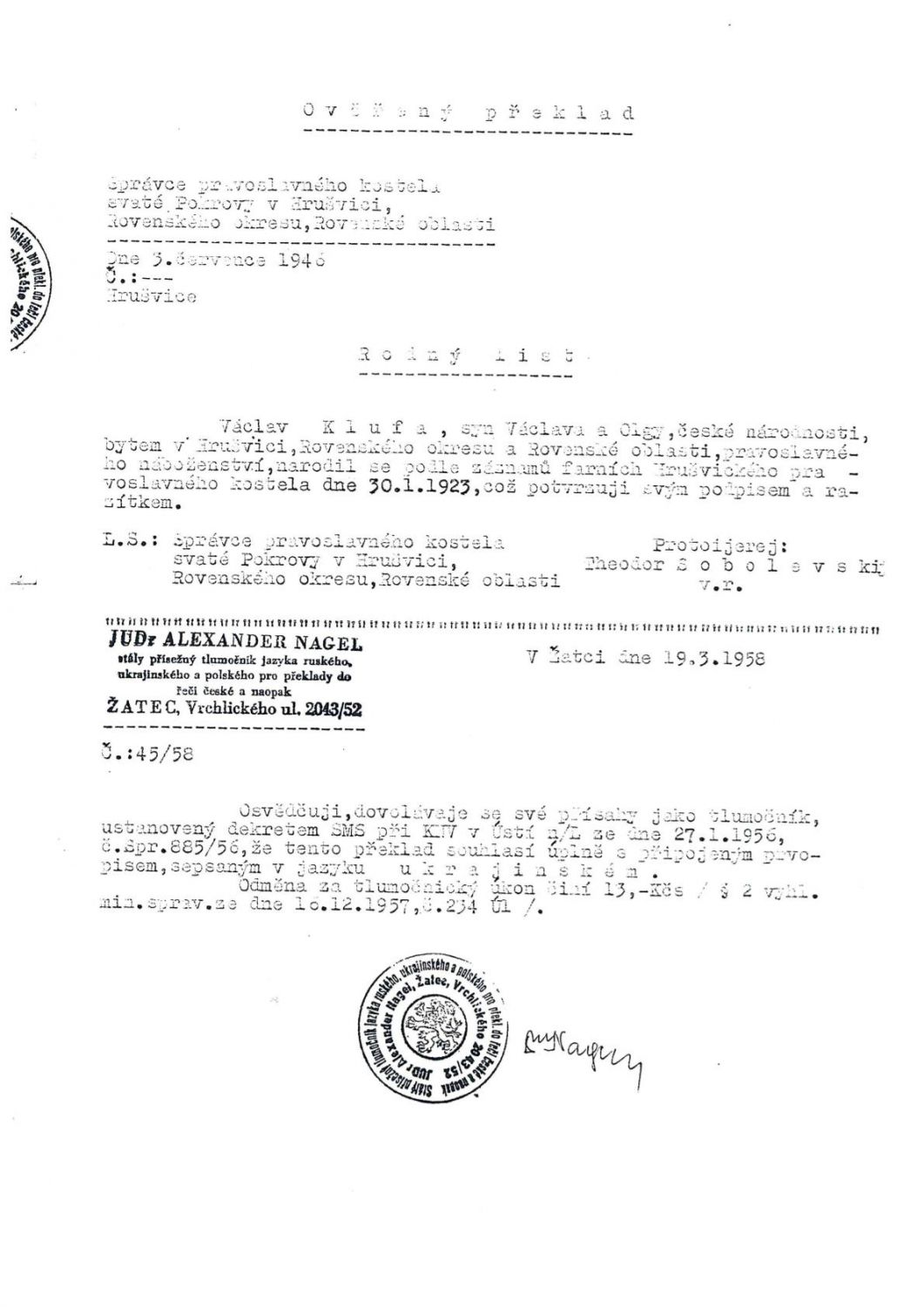 Překlad dokladu o narození Václav Klufa z roku 1958