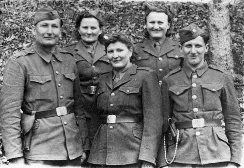 Rodina Kozákova za války v lese na polském území začátkem roku 1945 (zleva: otec František, matka Zdenka, nejstarší sestra Emilie, starší sestra Anastazie)