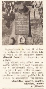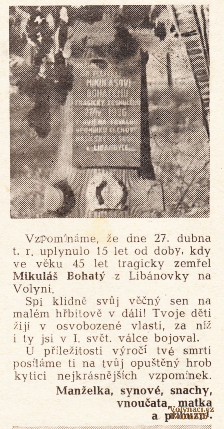 Velel sboru dobrovolných hasičů a také byl kapelníkem místní dechovky, složené vesměs z mladých chlapců. Jeho činnost byla solí v očích některých okolních Poláků. Snad v tom hrála určitou roli osobní zaujatost šesti bratrů Drewlových z Bryščí. Snad nějaké osobní účty. V roce 1935 Bohatý hrál s kapelou na taneční zábavě v Bryščích. Bratři Drewlové vyvolali rvačku a noži jej ubodali k smrti. Zřejmě se k tomu předem plánovitě připravovali, neboť ze začátku zaútočili na kapelu láhvemi naplněnými pískem. Zaskočení hudebníci, přes statečnou obranu, nestačili svého kapelníka ubránit. Zůstali po něm čtyři nezletilí synové. (z Kroniky Českých Dorohostají a přilehlých osad Libánovky a Máslenky )