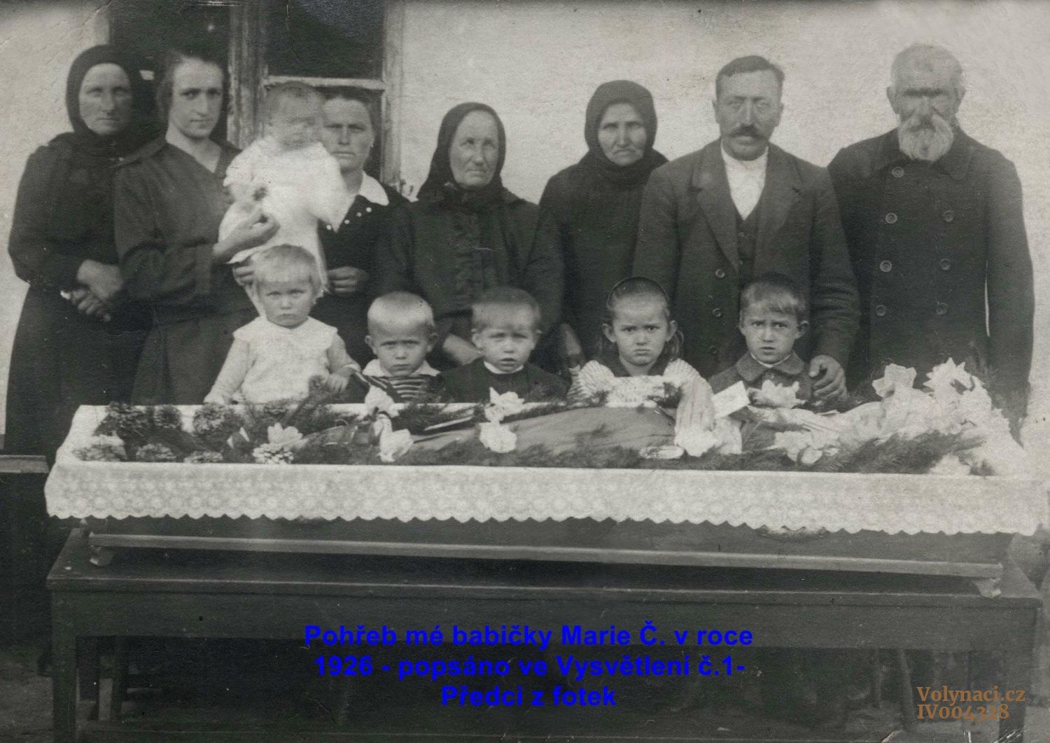 sedící ženy sestry Černé:Krásenská Antonie, Horáková Anna, Nedbálková Emílie, nahoře dcera Anny Antonie Nedbálková, muže dole Nedbálek Vladimír jeho bratr a manžel Antonie Nedbálek Antonín a Krásenský Josef asi Droužkovice nebo Údlice