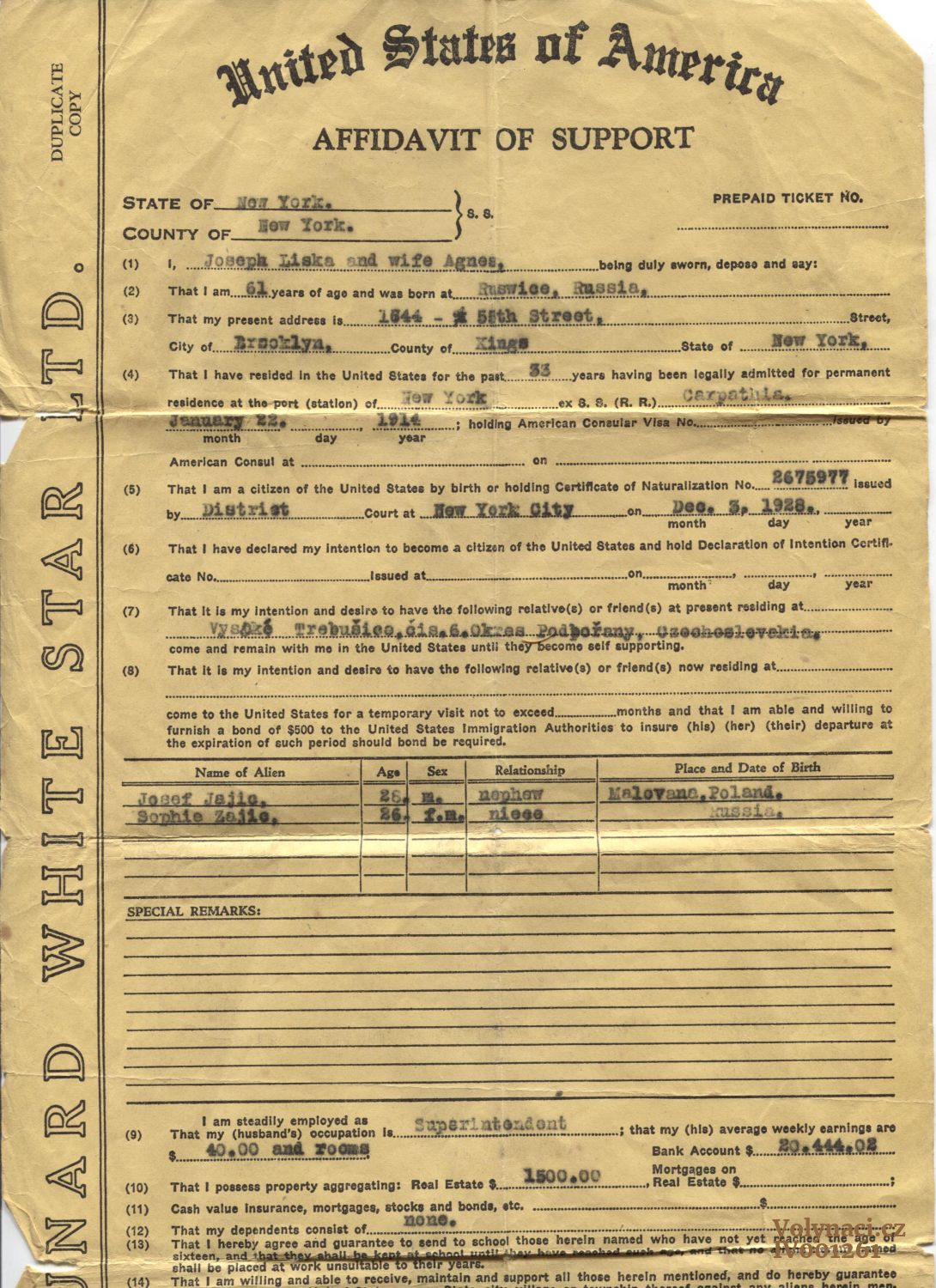 Zvací list do USA pro Zajíc Josef, Václav (1919-1988) a jeho 1. ženu Sofii od tety Anežky Liškové (Zajícové) a Josefa Lišky