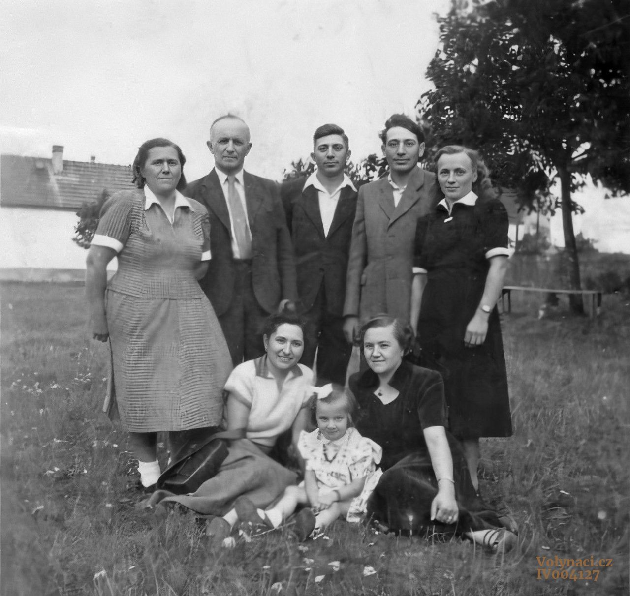 zleva Marie Toušková Malá, Antonín Malý, Haltuch Vladimír, Synek Vladimír - ,Haltuchová Marie, sedící Sahulková rozená Malá Emilie, Marie Synková Čonková a její matka Emilie Malá, Synková