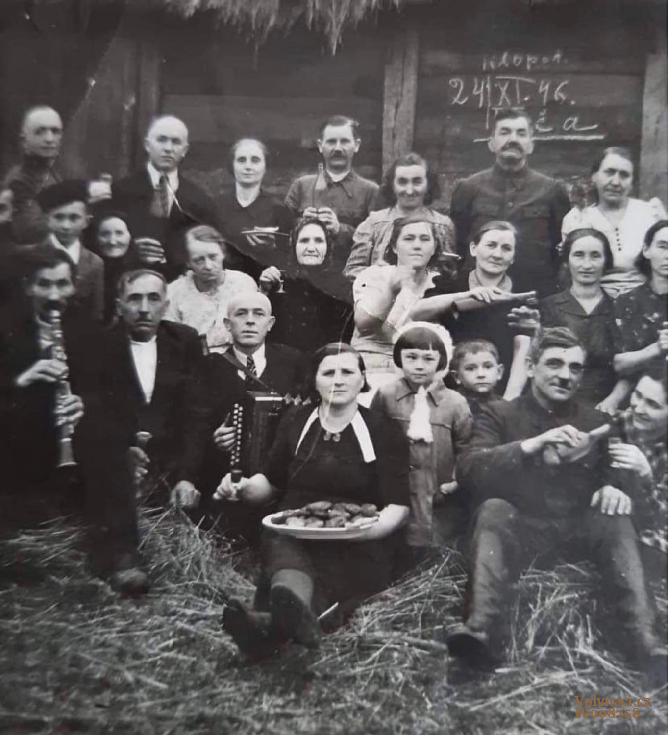 vlevo Malý Antonín, Josef, Sahulka Vladimír, Jindřich a Toušková Marie, Malá. Před ní Malá Emilie, Synková a Sahulková Jiřina. Úplně vpravo Malá Emilie, Sahulková v náručí s Annou. Ženu nad ní neznám. Odhadem