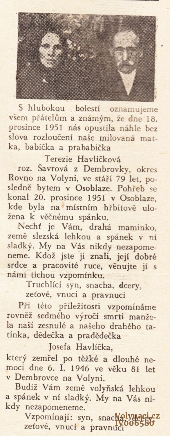 Rodina Havlíčkova - sedící s dětmi Terezie a Josef - stojící jejich syn Josef s manželkou Věrou roz. Krušinovou - děti Libuška 1936 a Miloslav 1934