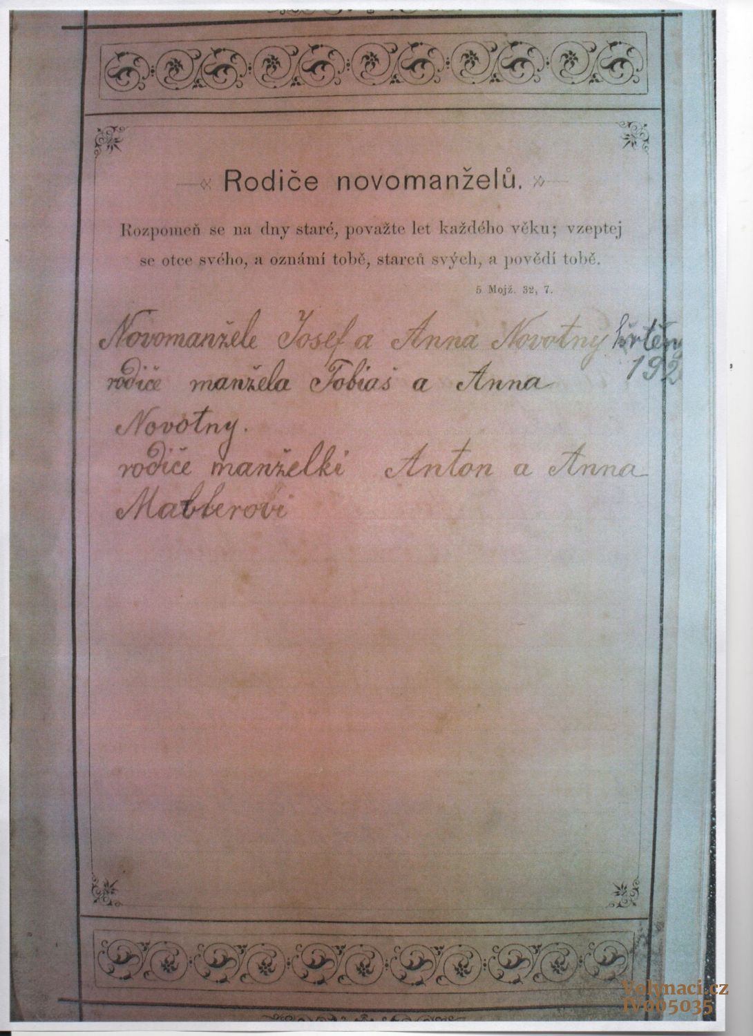 Záznam do RB novomanž. Josef a Anna Novotných s uvedením rodičů
