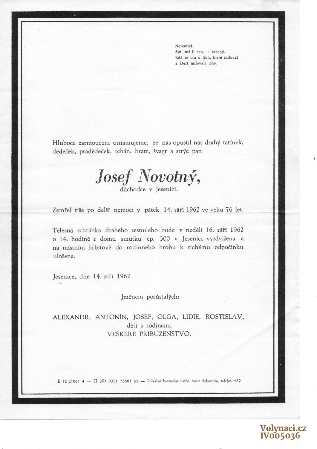 Parte o úmrtí Josefa Novotného nar, 1886
