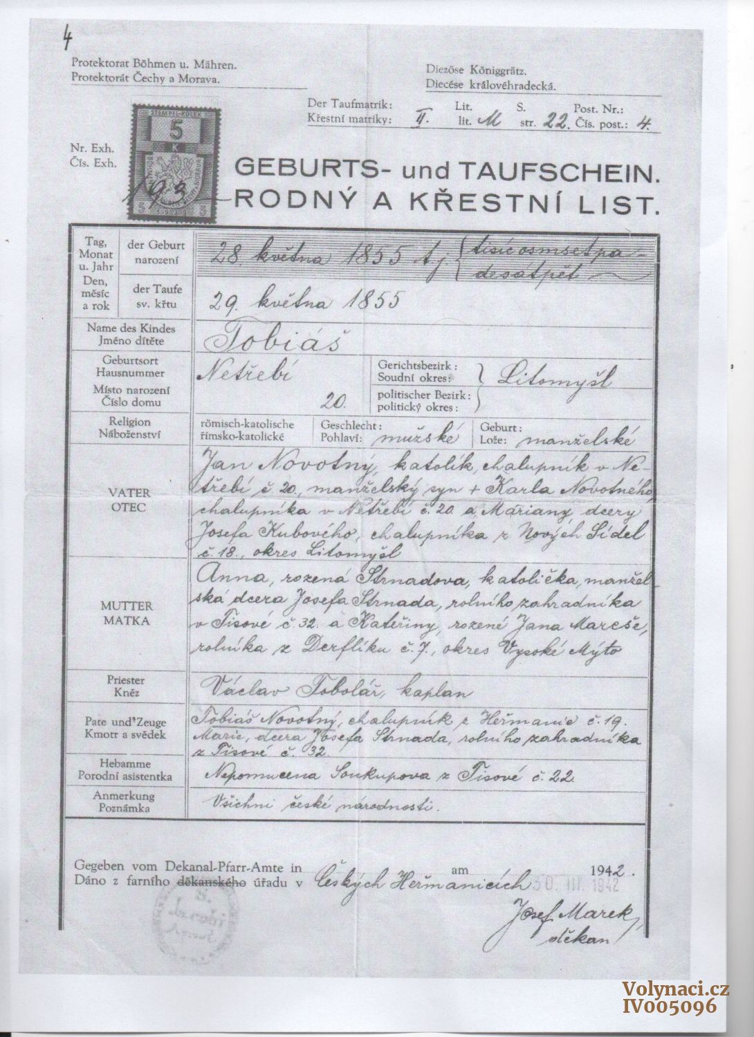 Dle sdělení dcery Ludmily Novotné provdané Majkrákové byly dokumenty vyžádány jejím otcem Novotný Josef, Jan 1886-1962 za účelem potvrzení české národnosti obou rodičů žadatele, neboť hrozilo vystěhování rodiny do Gulagu.