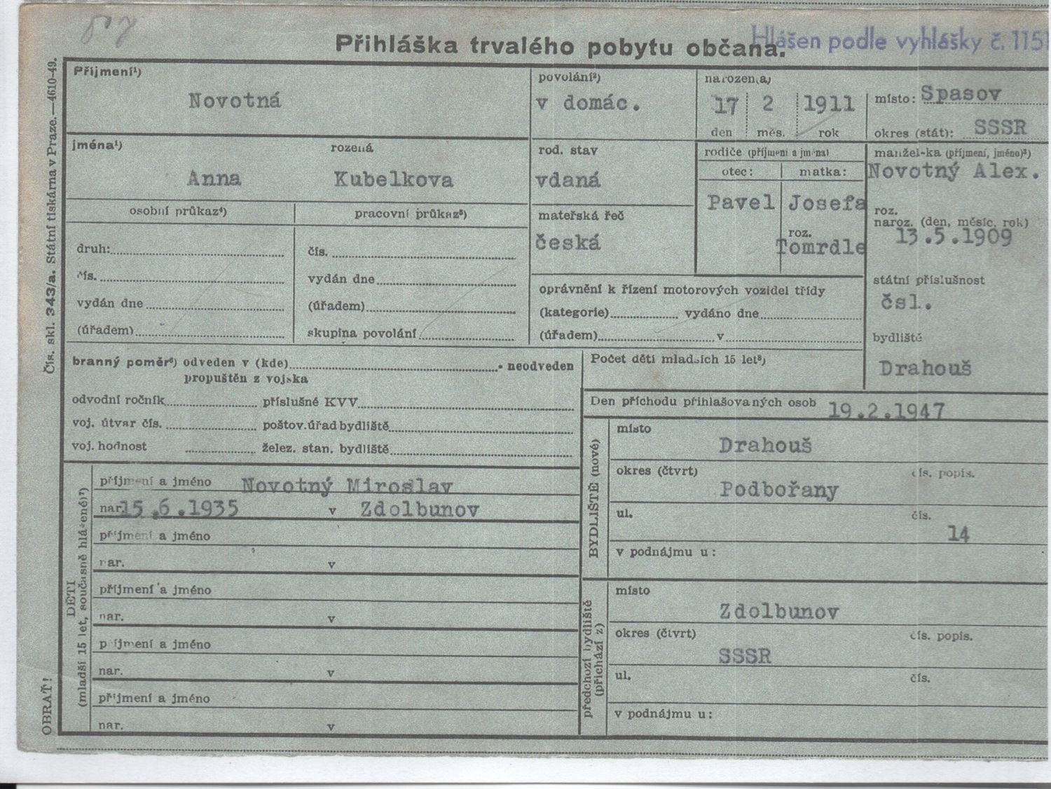 Přihláška trvalého pobytu občana Novotná Anna, rozená Kubelková nar. 17.2.1911 v Spasov SSSR. Otec Pavel Kubelka, matka Josefa, roz. Tomrdle, manžel Novotný Alexandr nar. 13.5.1909