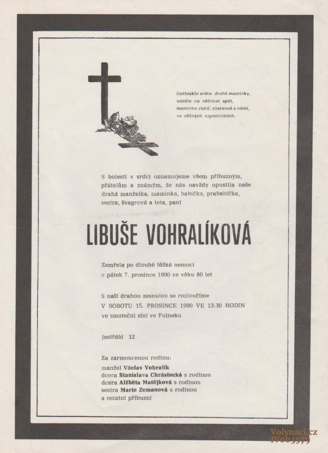 Po svatbě dcery Stanislavy tato s manželem převzala dům v Jestřabí a Vohralíkovi se přestěhovali na sousední výměnek. Libuše zemřela 7. prosince 1990 v nemocnici v Odrách, po smrti byla pohřbena na hřbitově ve Fulneku.